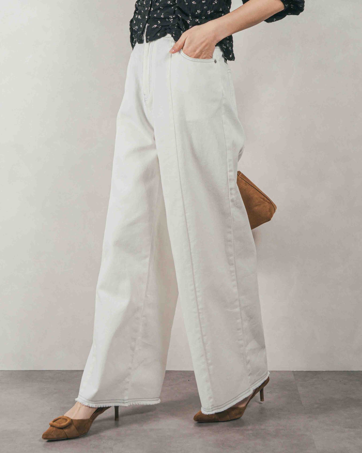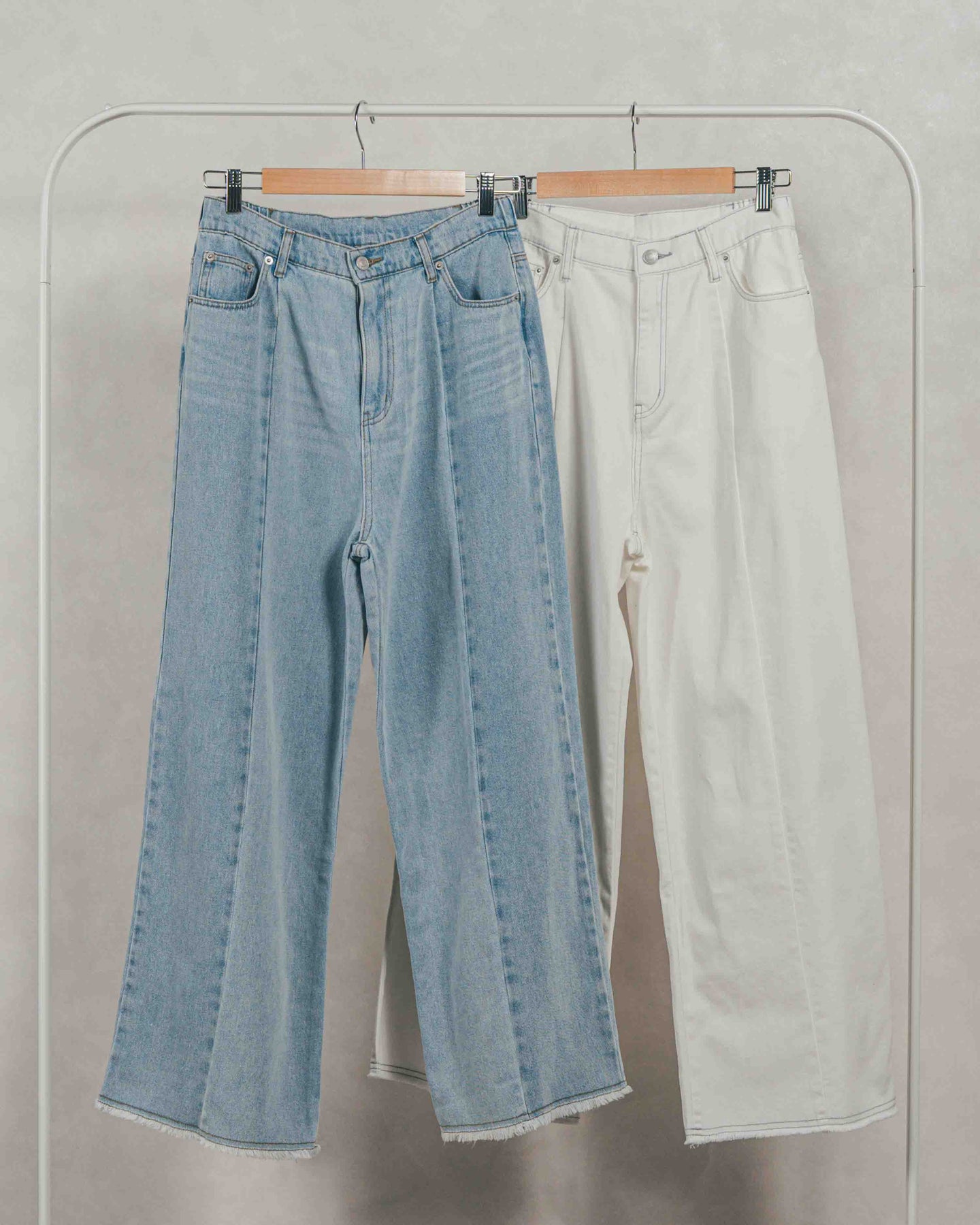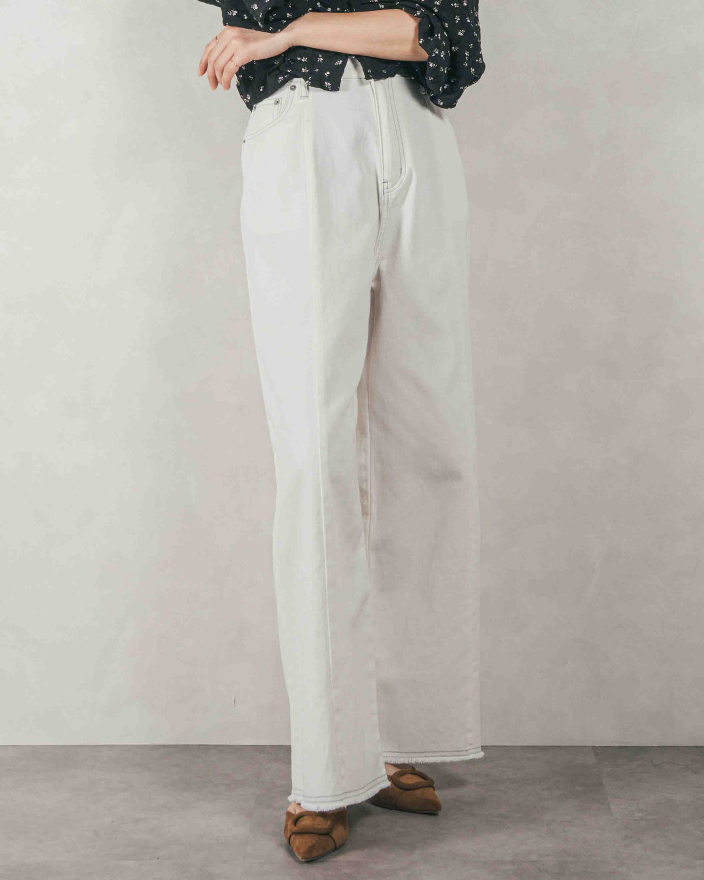 サイドの切り替え、ほんのすこし異なるカラーで仕上げました。主張しすぎないのに、少しのアクセント。センターシームのラインは縦ラインを引き立たせ、脚をすっきり長く見せてくれます。※バイカラーはBLEACHのみです。(OFFは単色仕様)