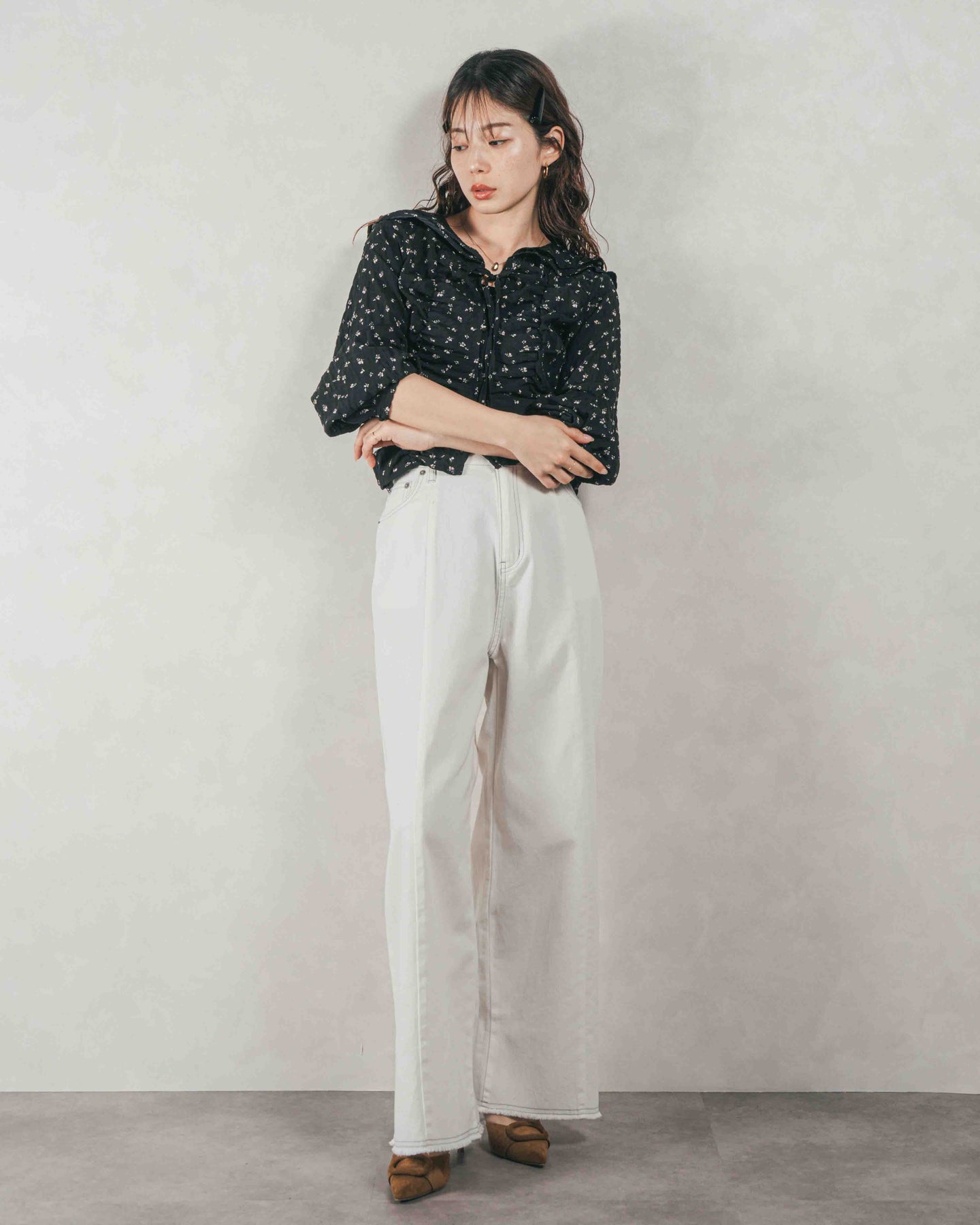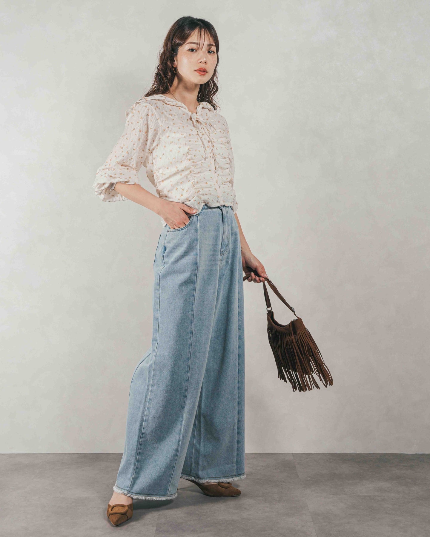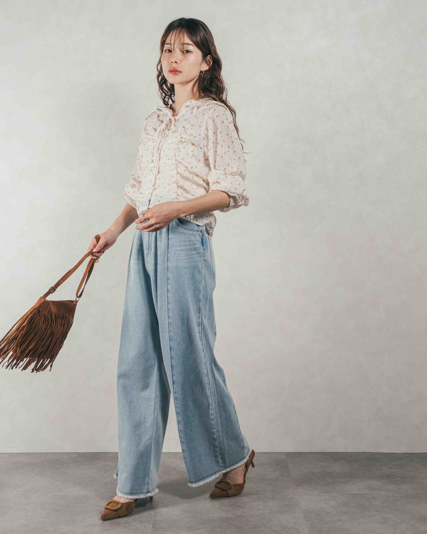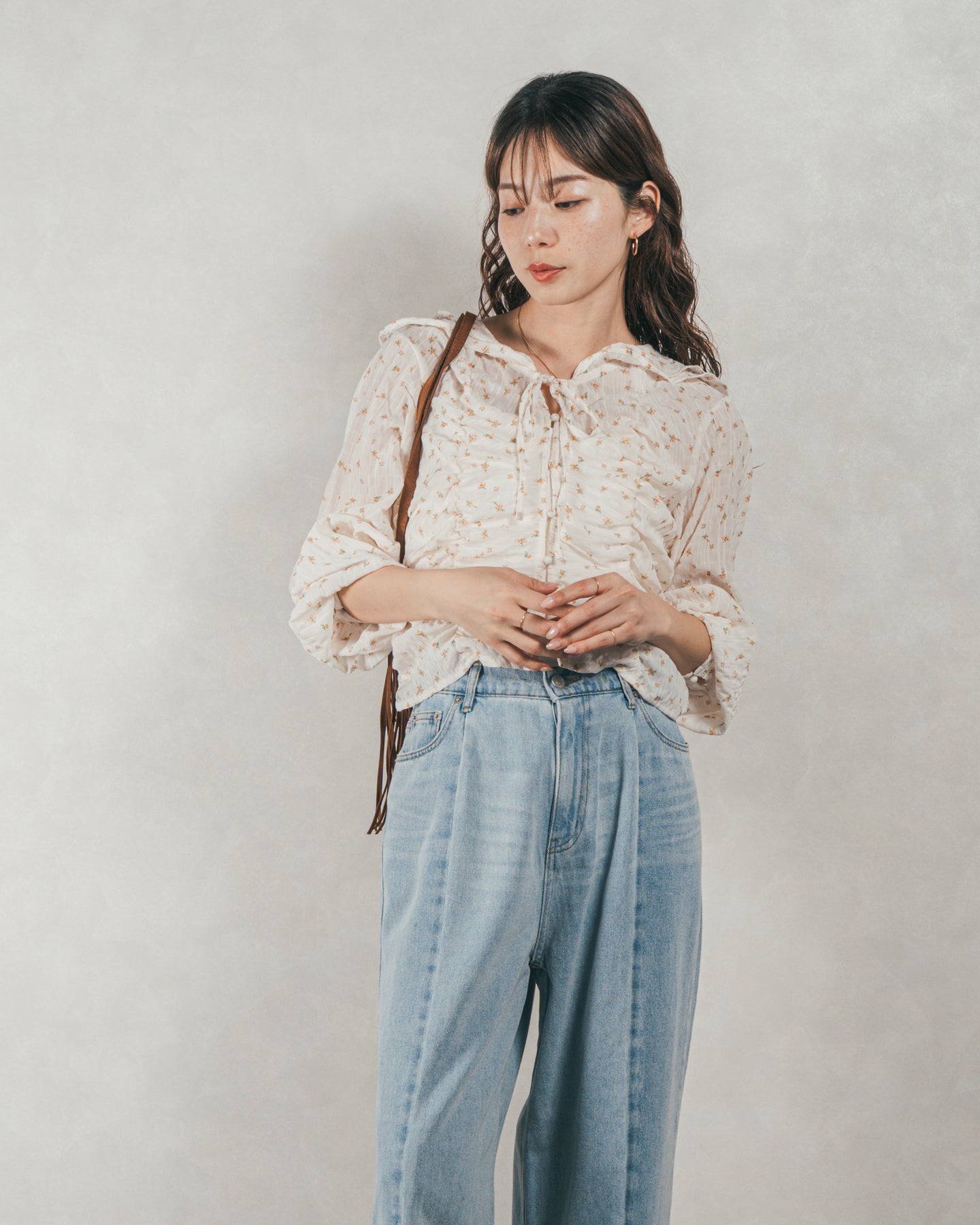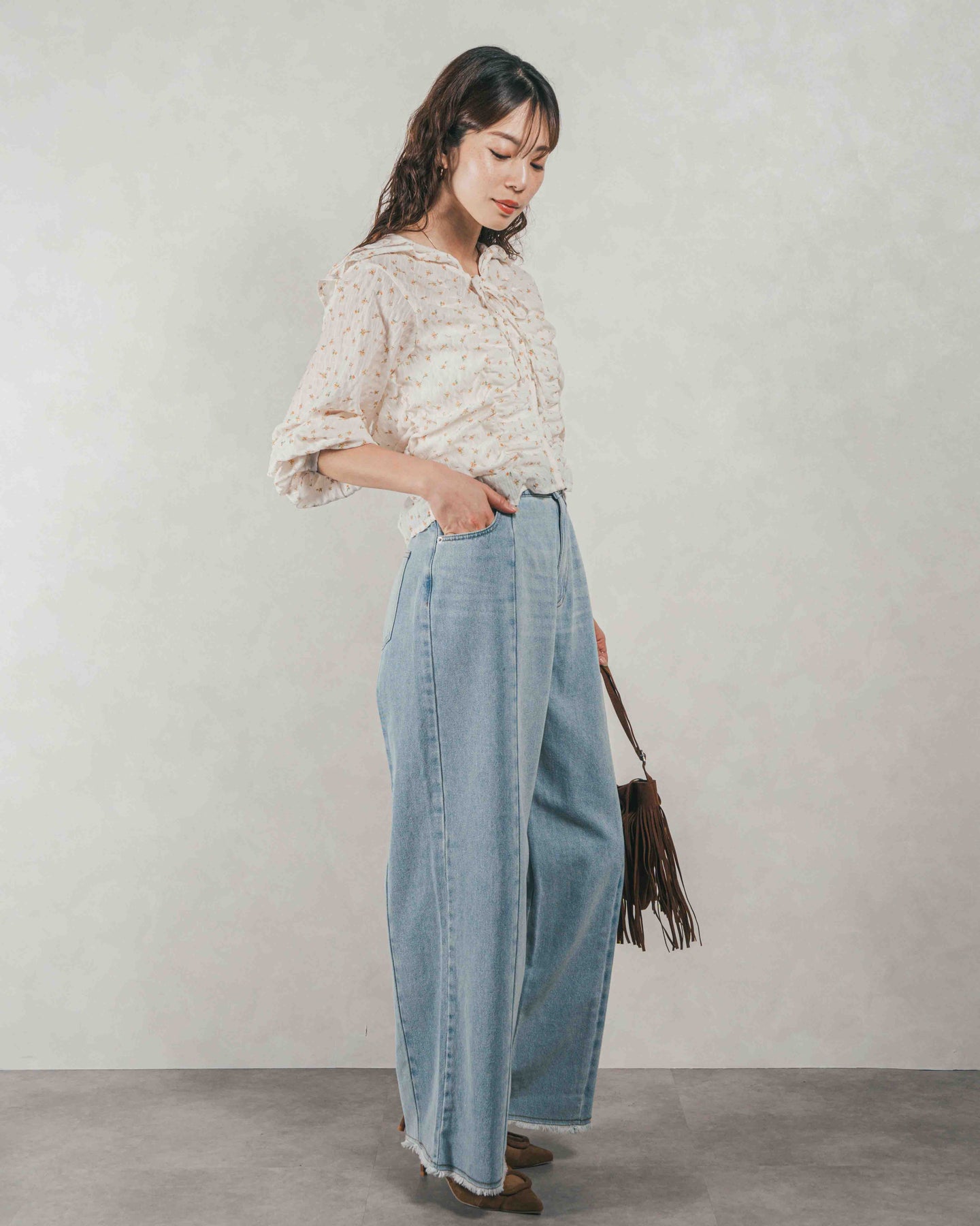 [SET]Flowerプリントフリルブラウス + 10oz ニュアンスバイカラー リラックスワイドデニム(2SET)