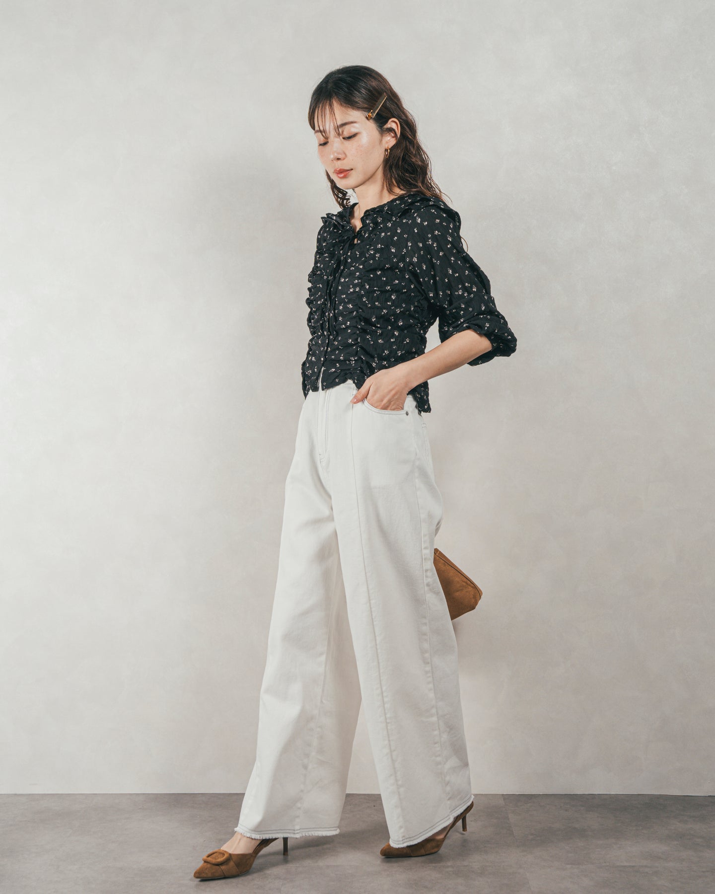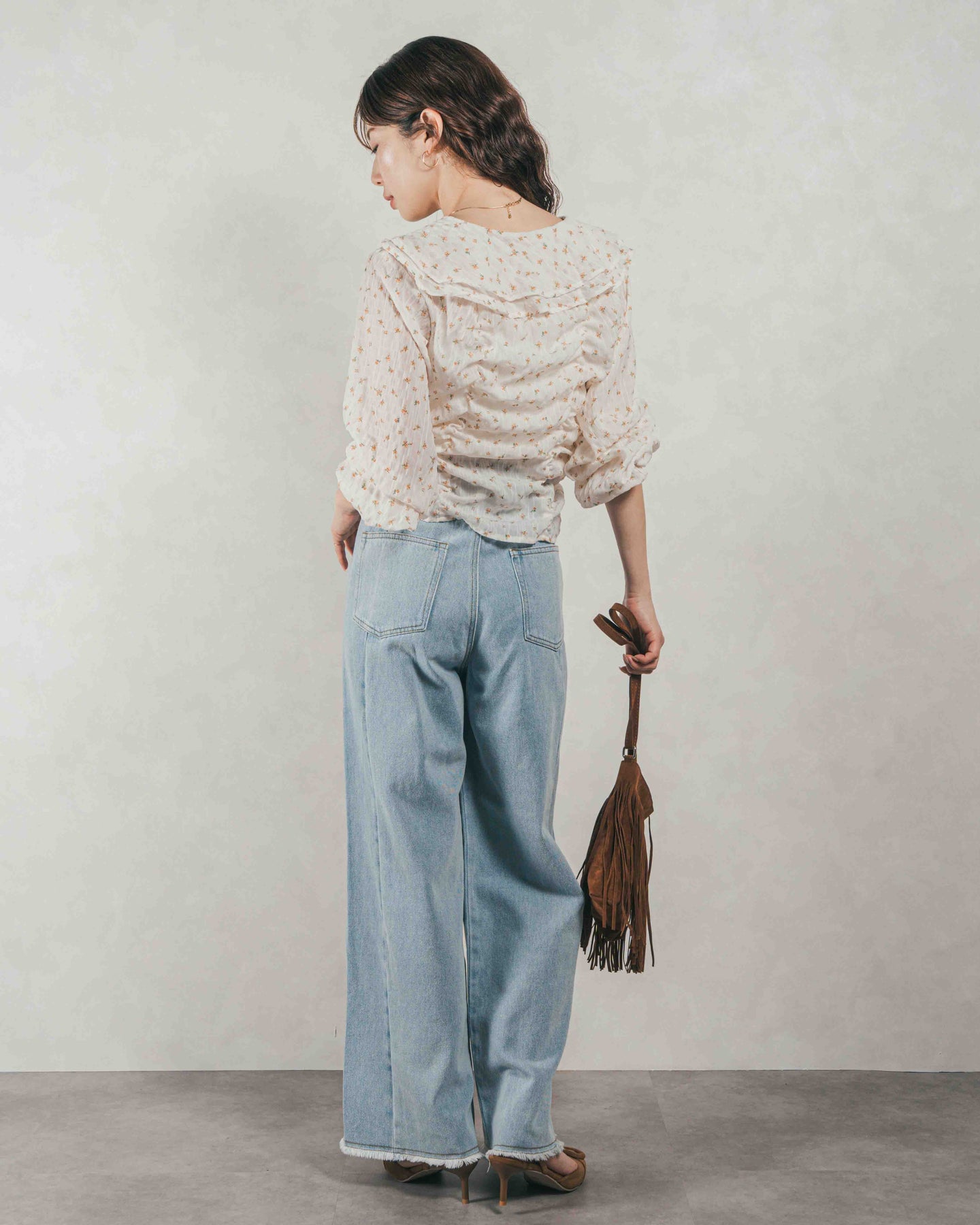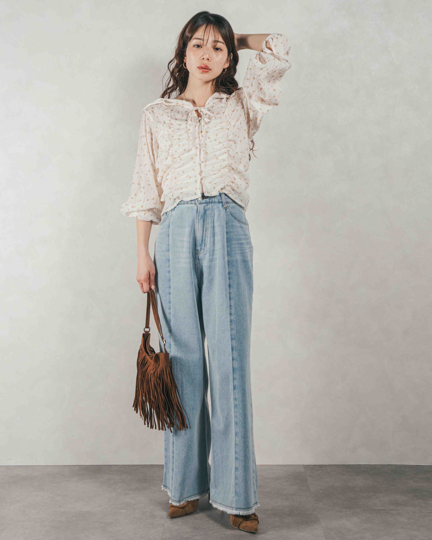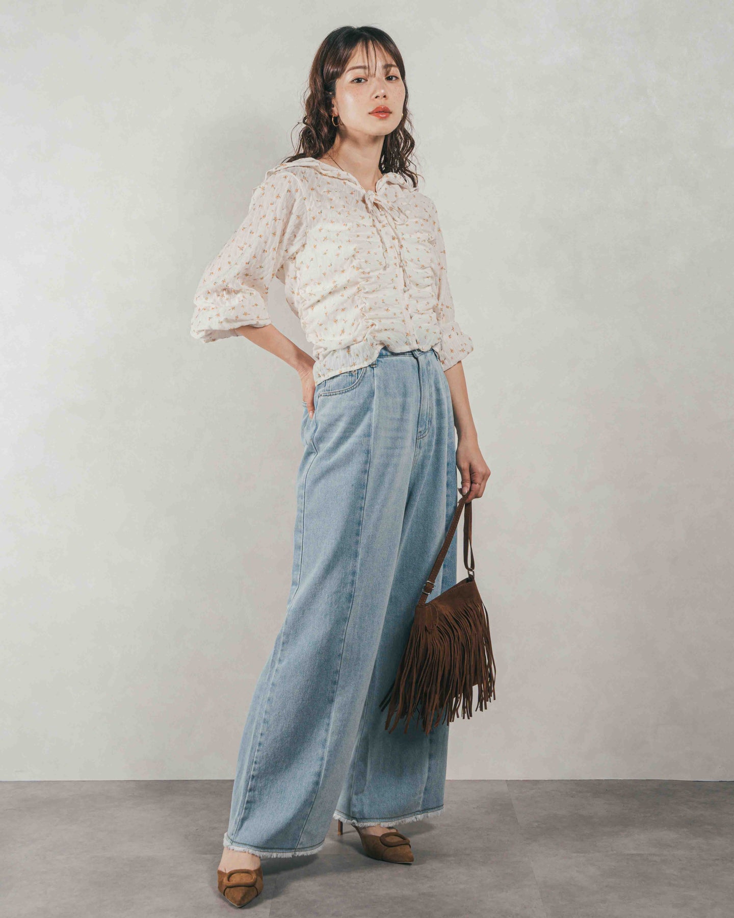 [SET]Flowerプリントフリルブラウス + 10oz ニュアンスバイカラー リラックスワイドデニム(2SET)