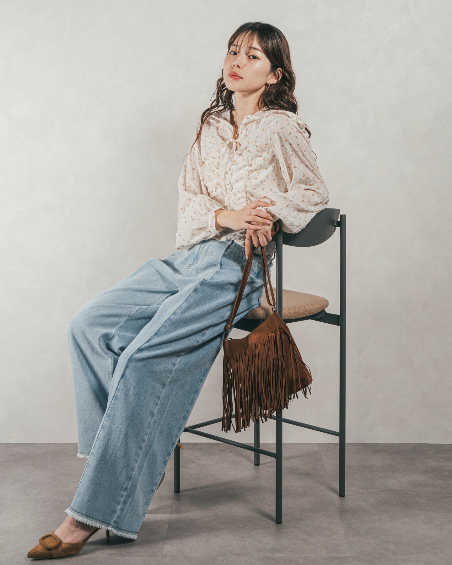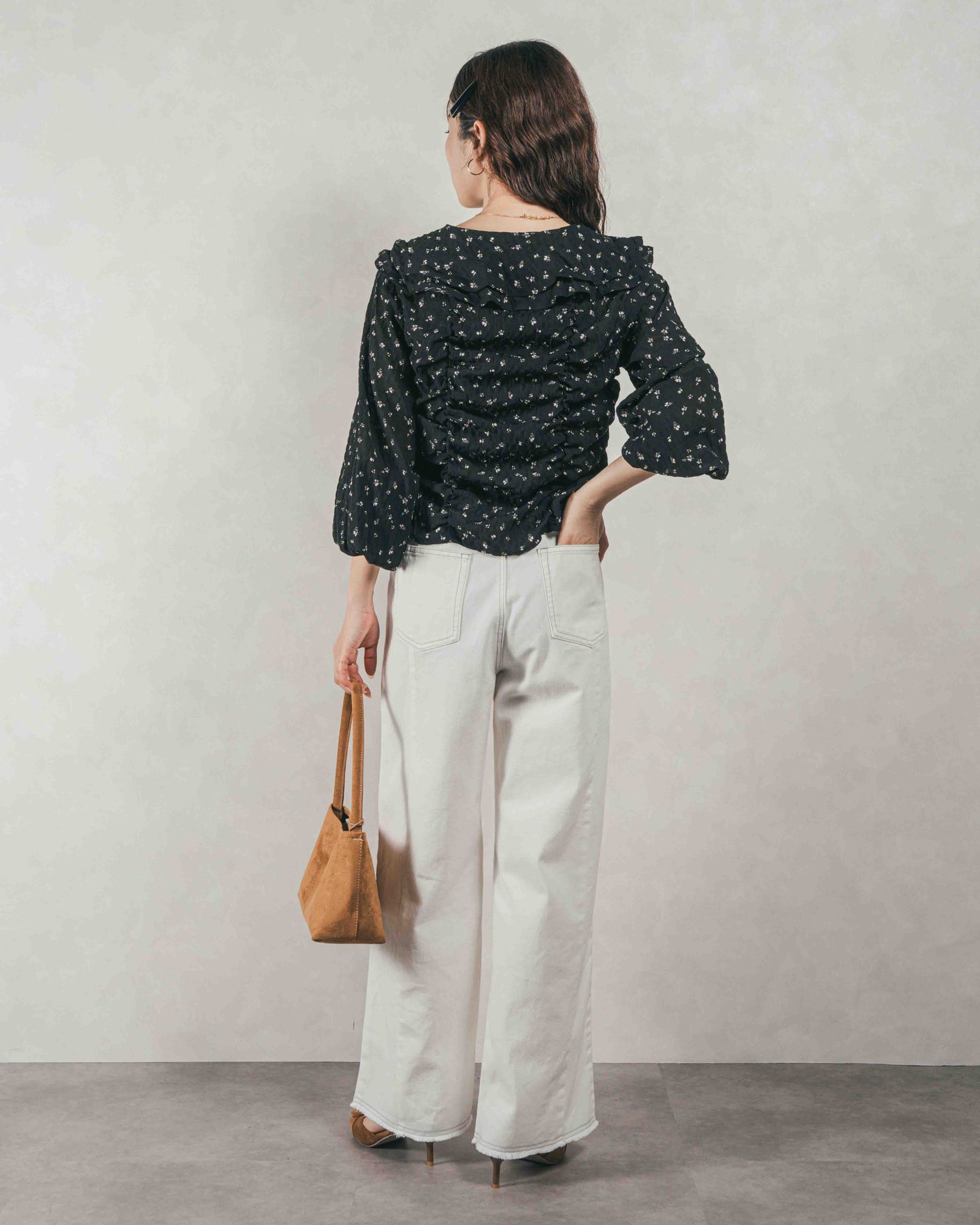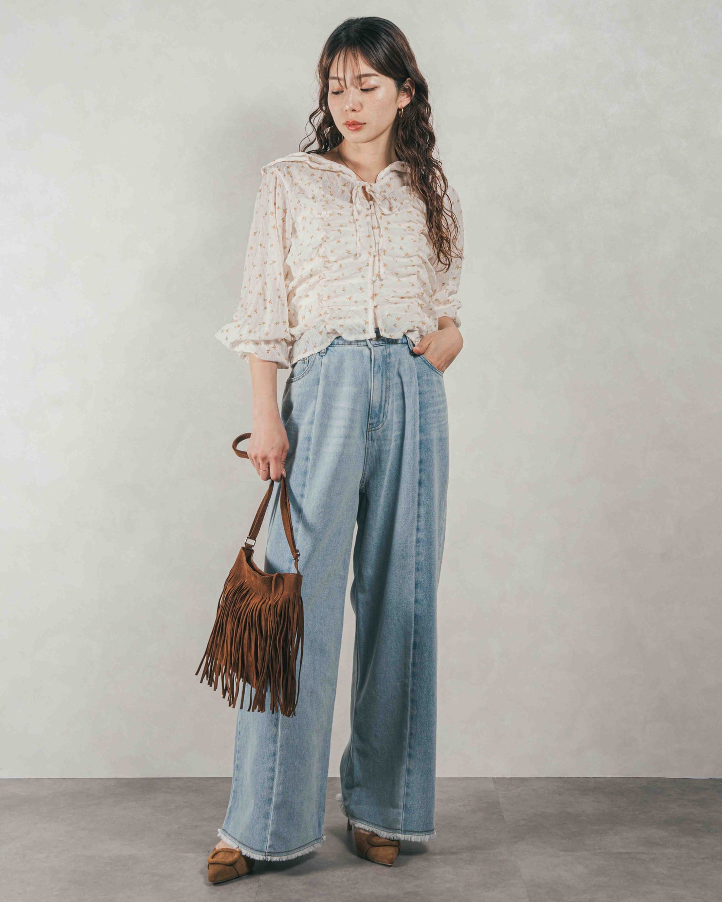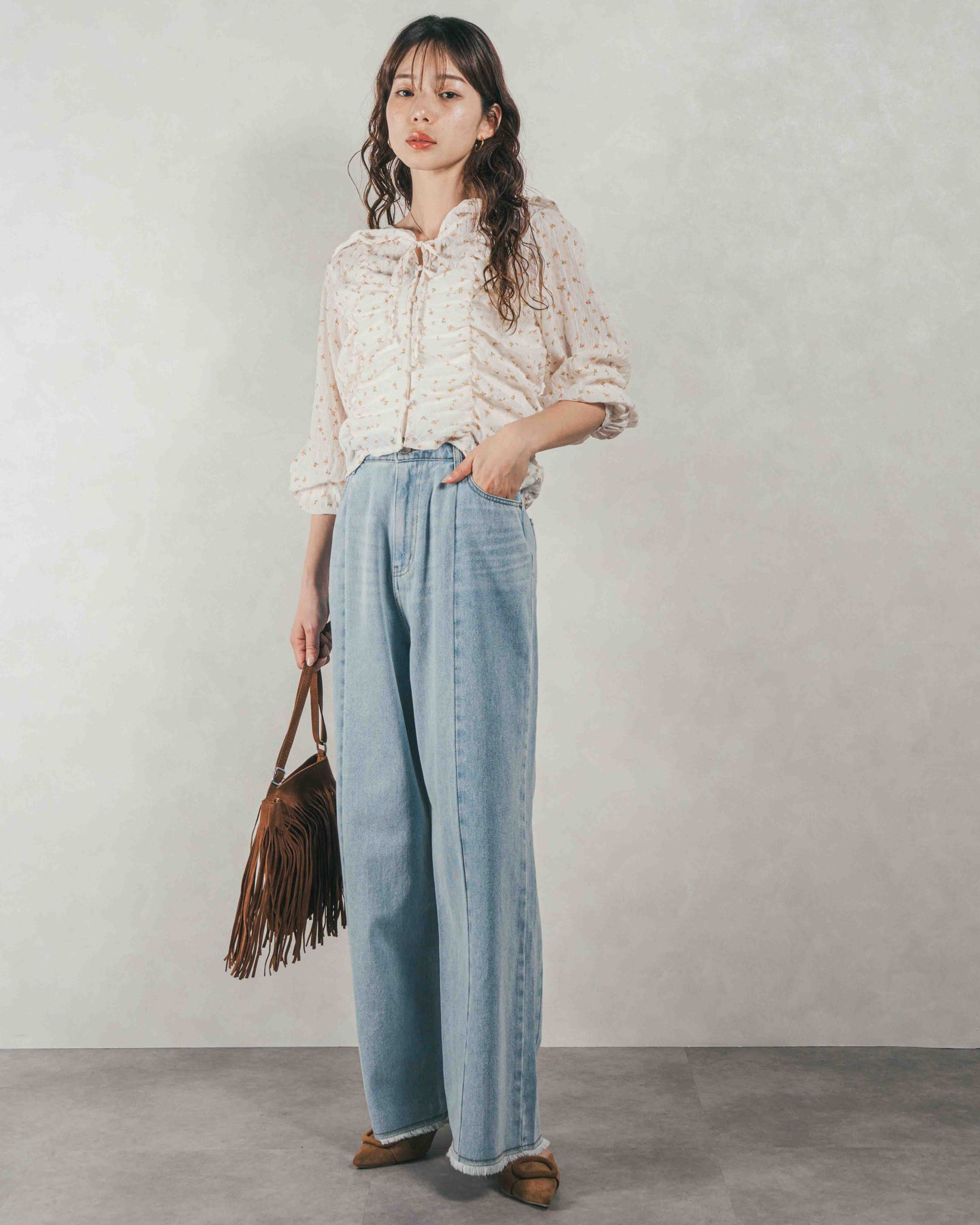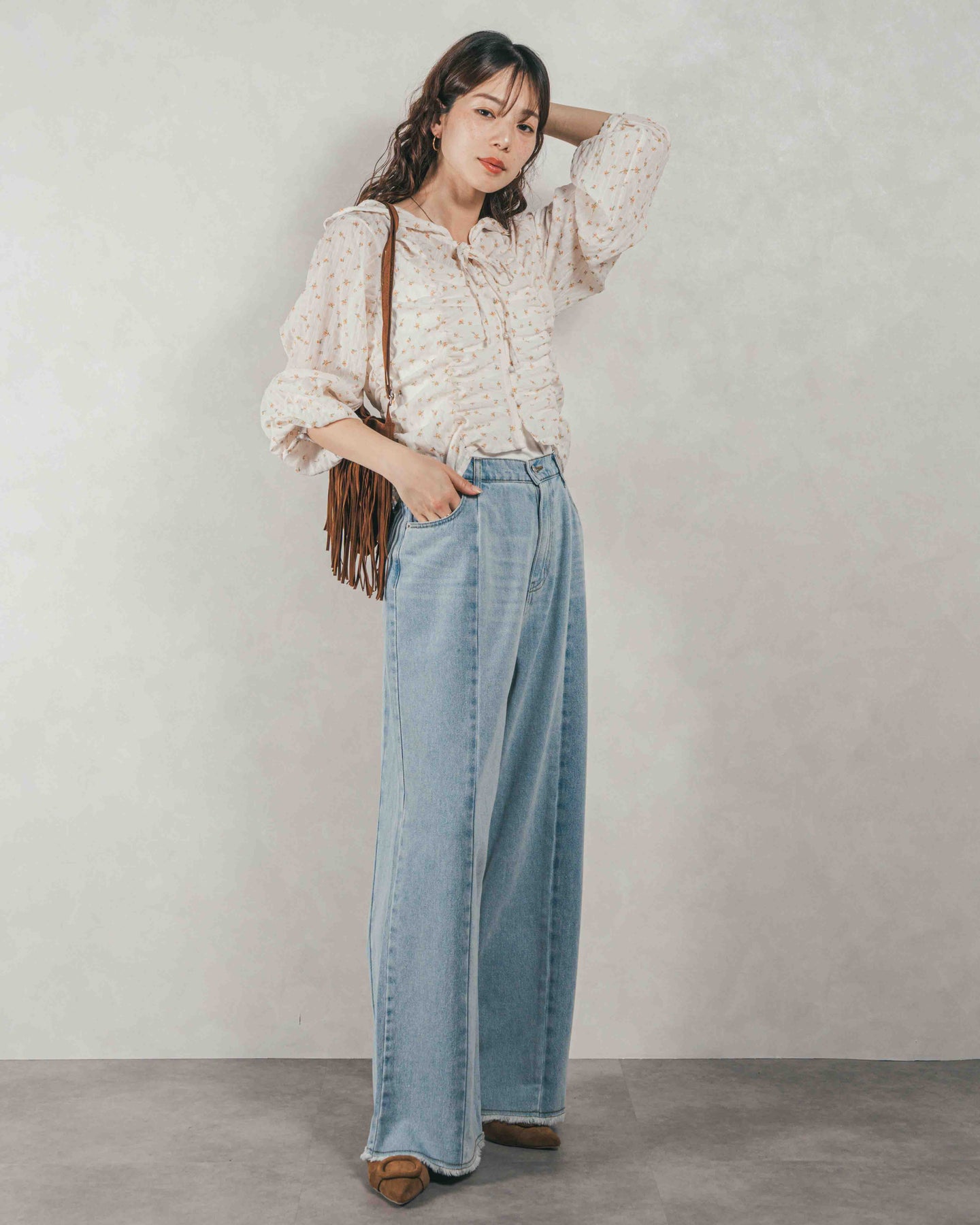 [SET]Flowerプリントフリルブラウス + 10oz ニュアンスバイカラー リラックスワイドデニム(2SET)