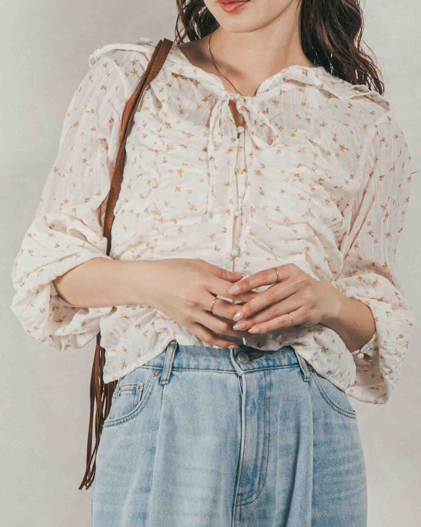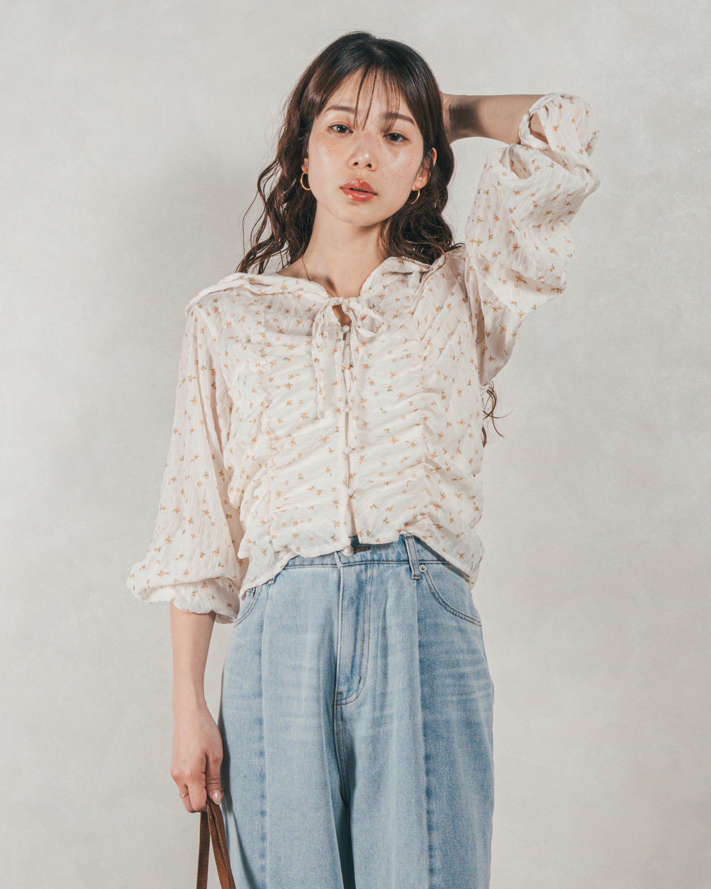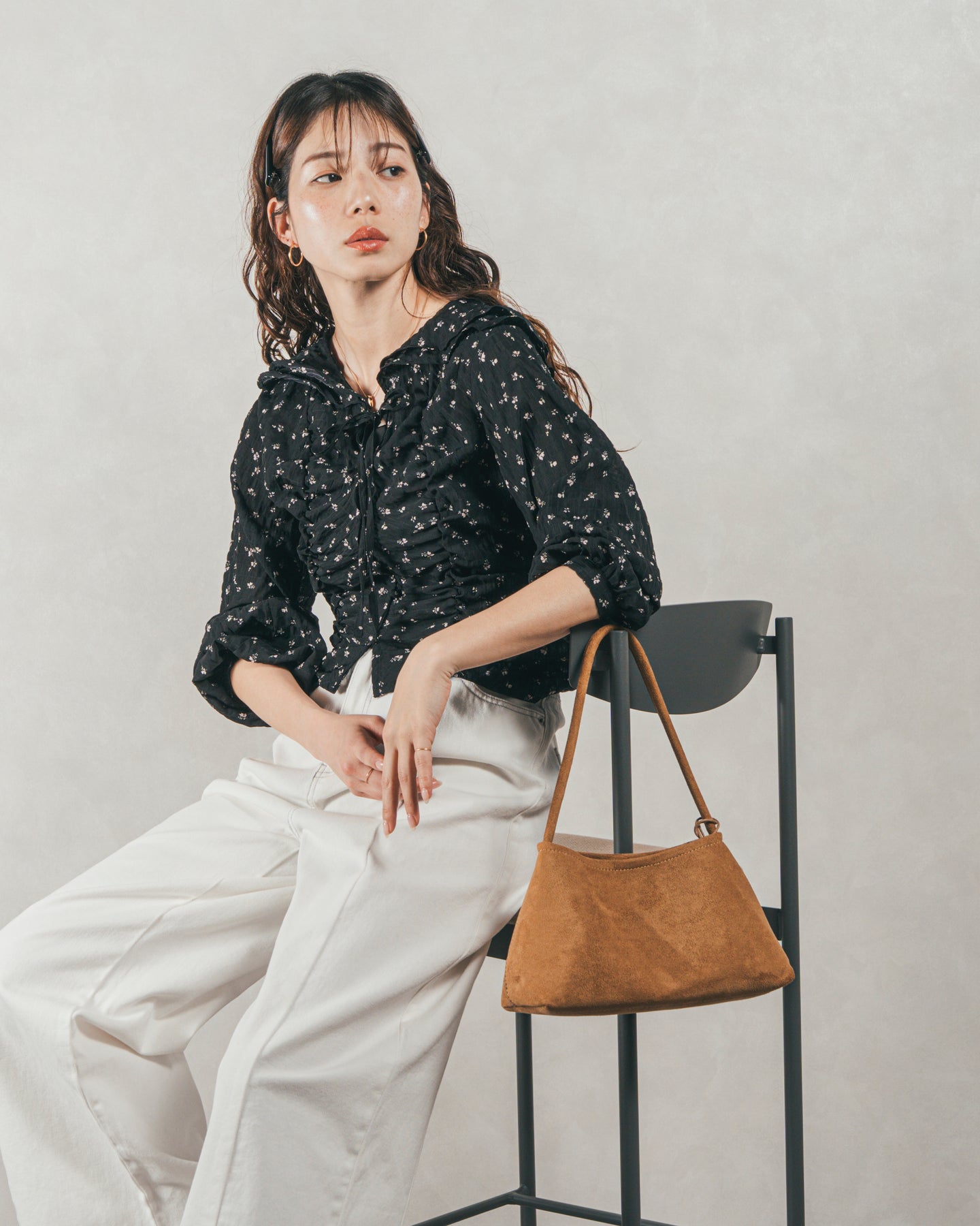 主張しすぎない小花柄で、取り入れやすい春アイテム。シフォン素材の軽やかな素材感です。