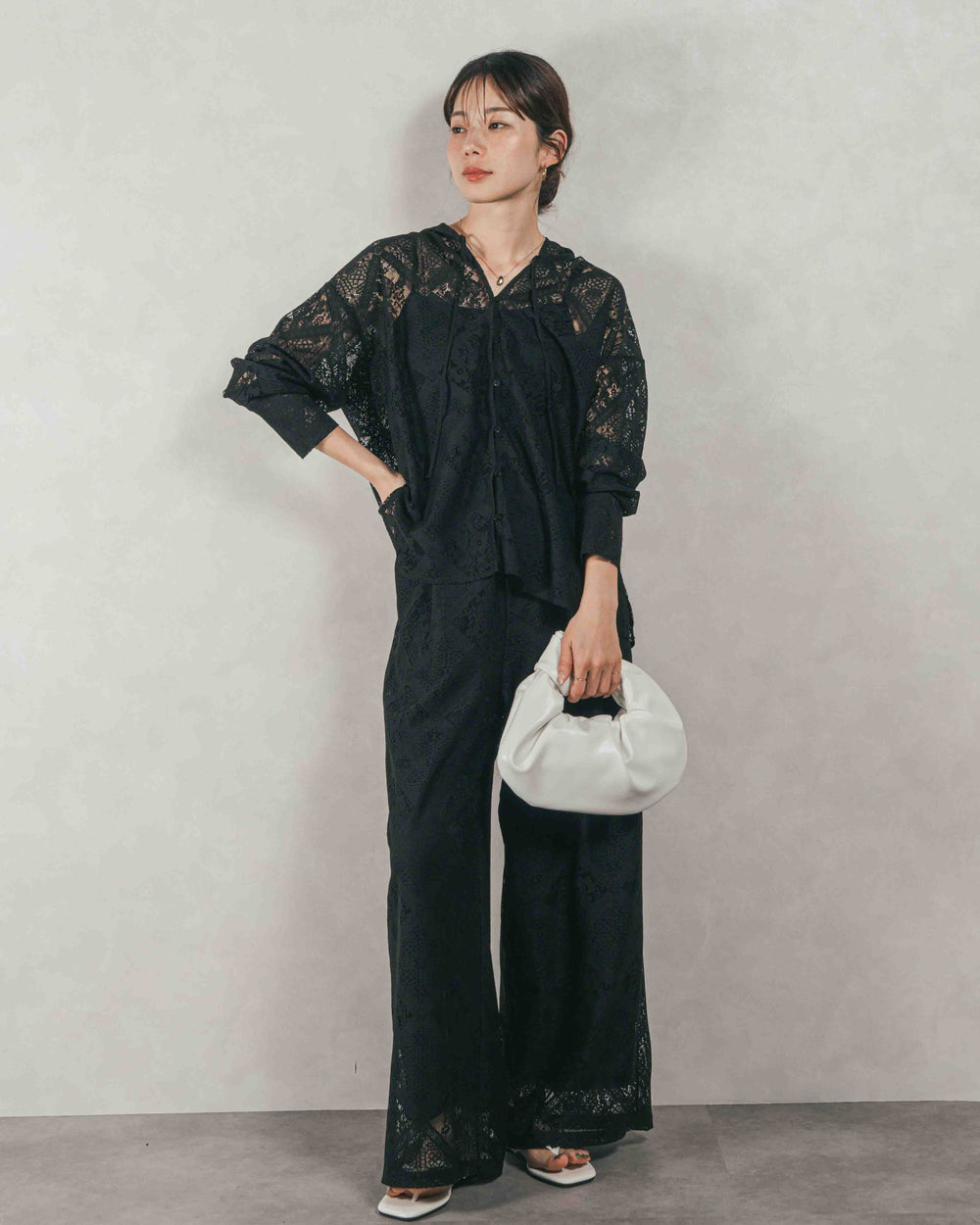 フェミニンな印象だけでなく、ボトムスはカジュアルダウンさせる引き算コーデがおすすめです。ブラックデニムやワイドパンツ、スゥエットと合わせれば、甘さが程よく中和され、こなれた大人のミックススタイルに。