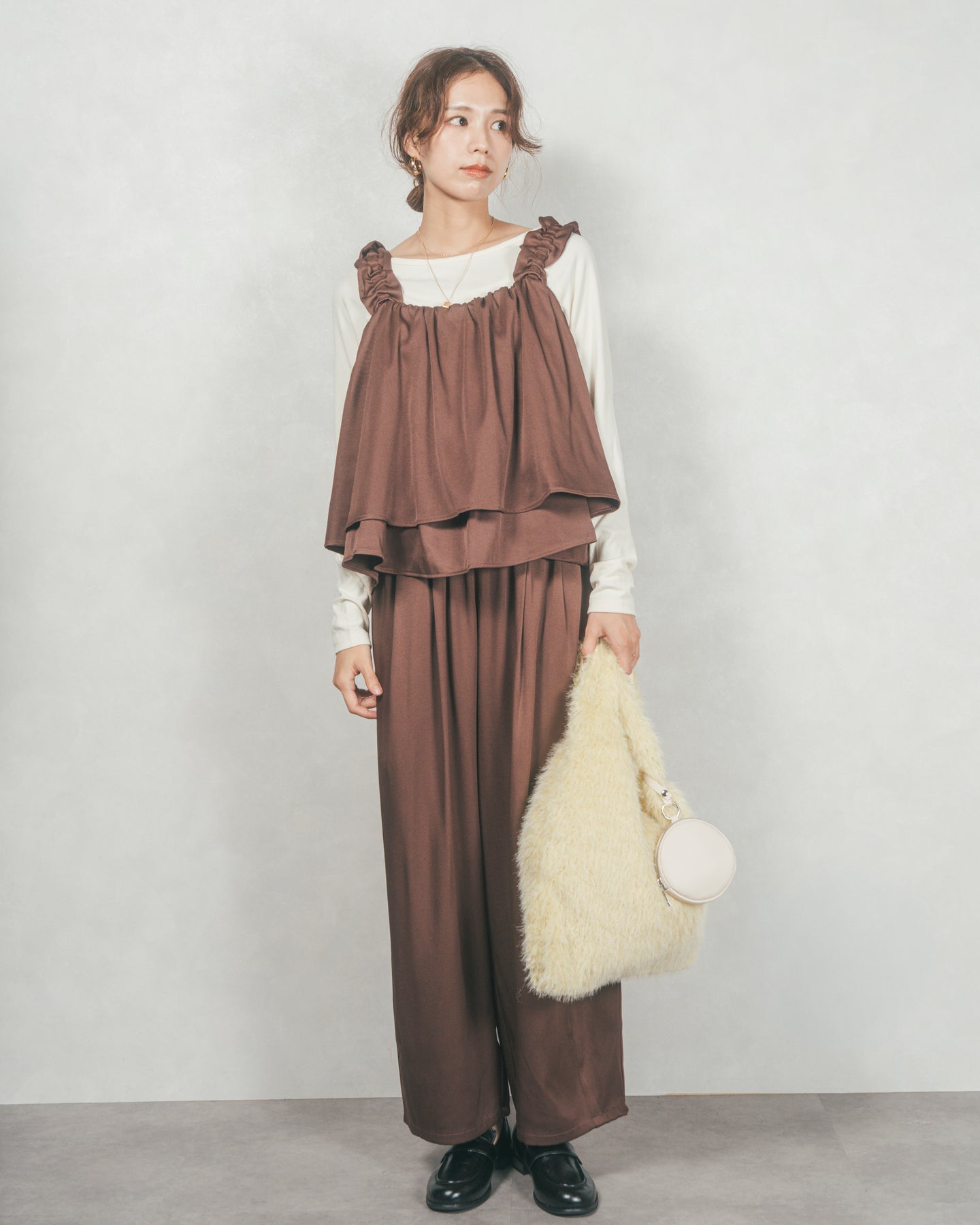 秋の装いに華やかなアクセントをプラスするフリルビスチェ。柔らかなフリルが顔周りを優しく彩り、レイヤードスタイルに女性らしい立体感を演出します。程よい甘さとモード感を兼ね備え、秋の軽やかなニットやシャツに重ねるだけで、旬のスタイリングが完成。デニムやワイドパンツと合わせてカジュアルダウンしたり、スカートでフェミニンに仕上げたり、様々な着こなしが楽しめます。街歩きや週末のお出かけに、季節感を感じさせる一着としておすすめです。