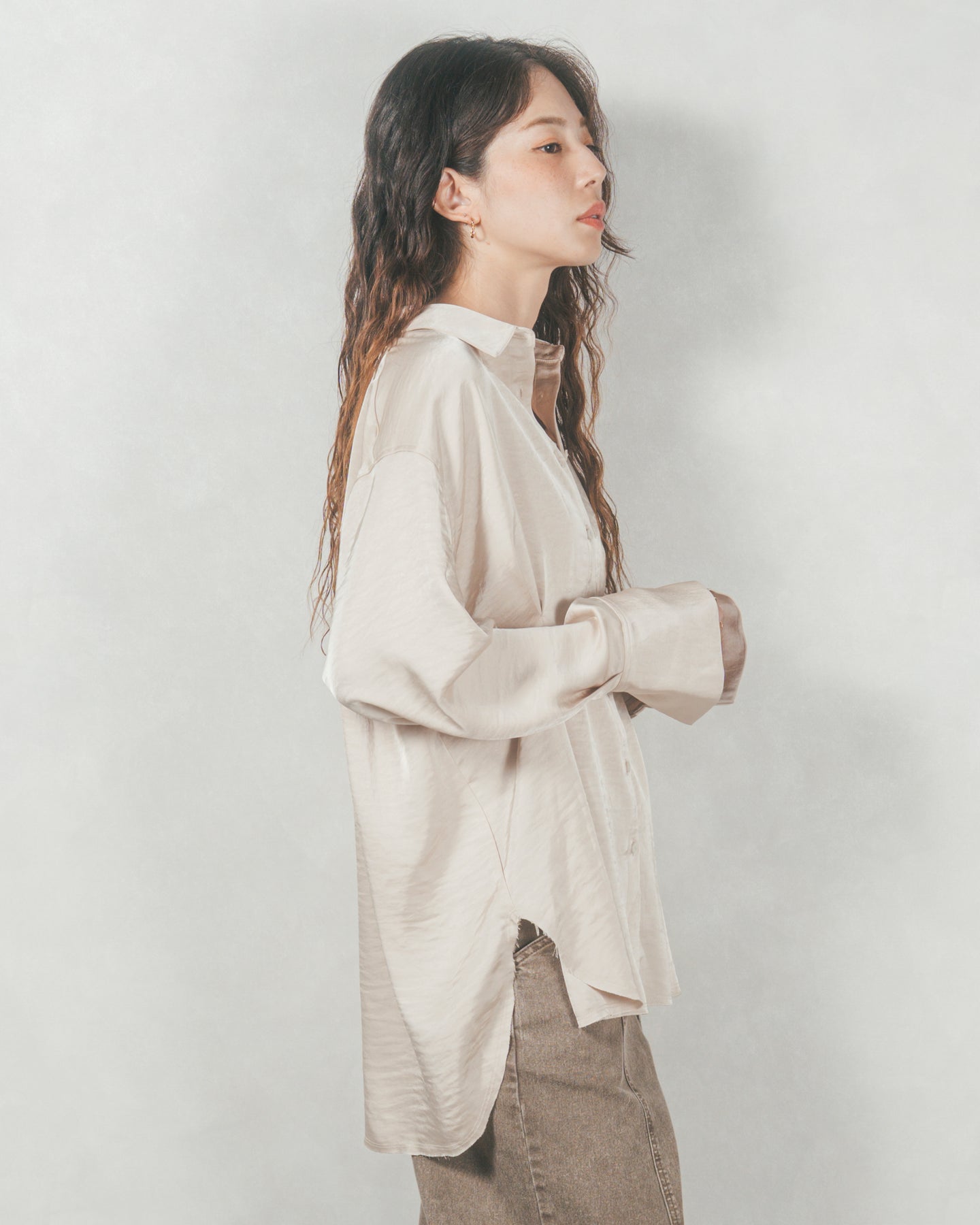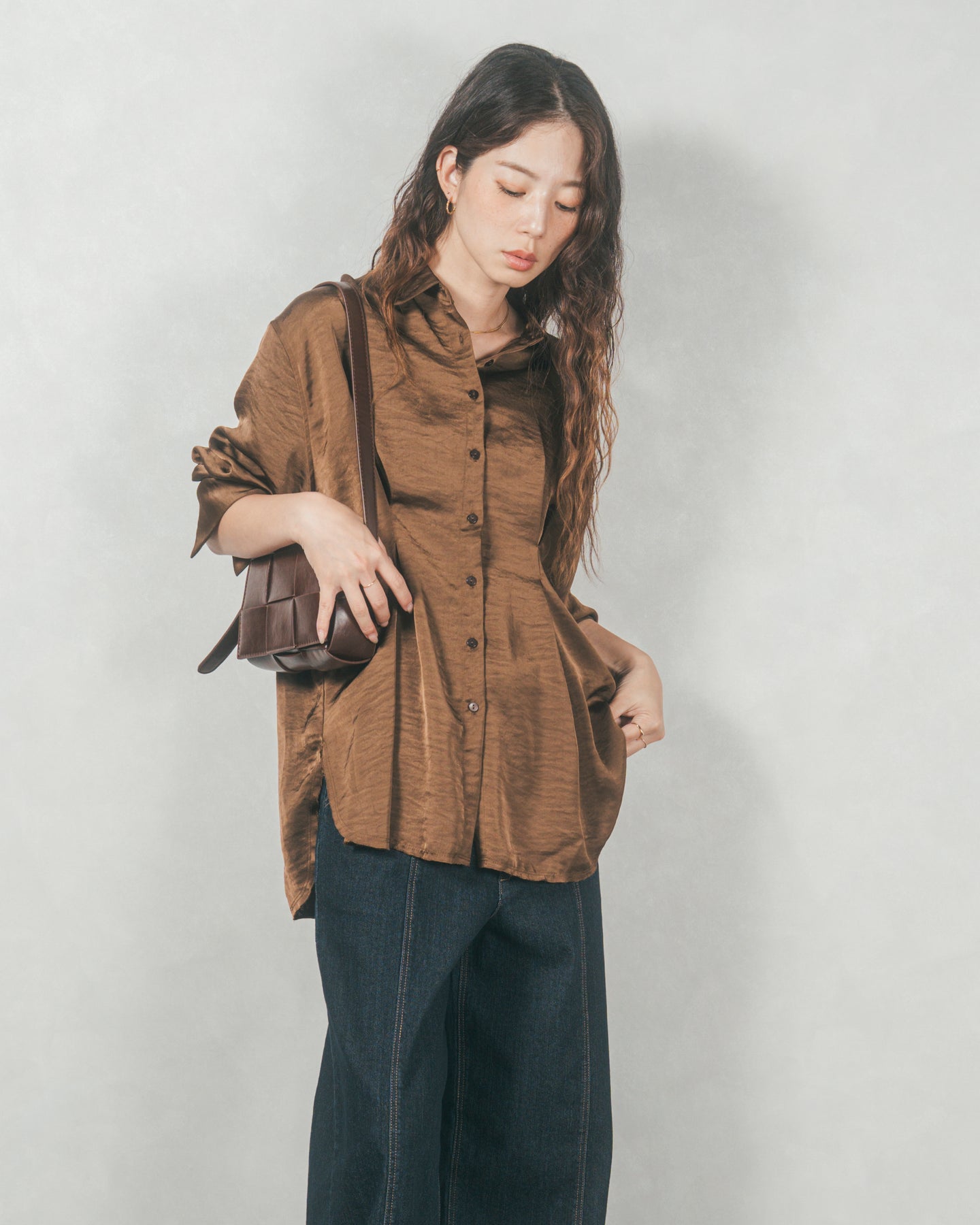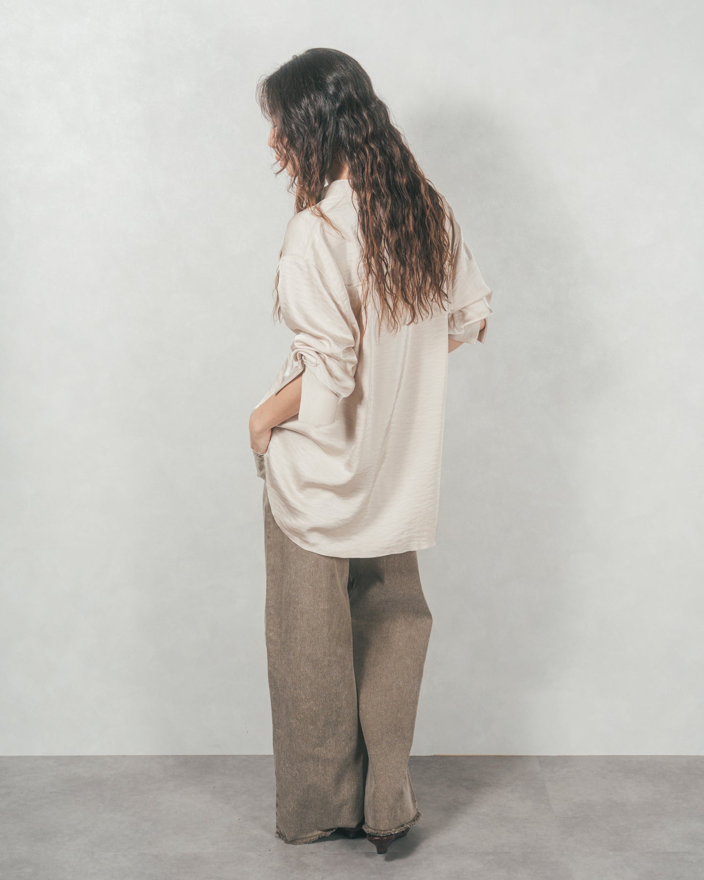 程よい光沢のマットサテンにワッシャー加工を施すことで、控えめながらも表情豊かな質感に仕上げました。トレンド感のあるカットオフ仕様の裾は、抜け感を演出しつつ、ダブルステッチで丁寧に仕上げています。(※ほつれが気になる場合はカットして整えてください。)