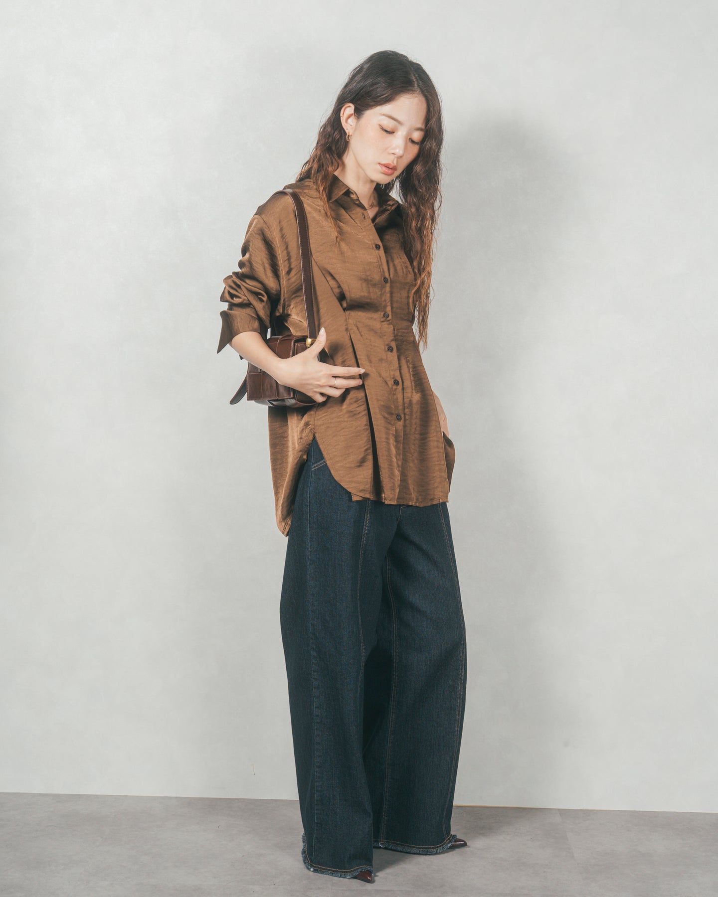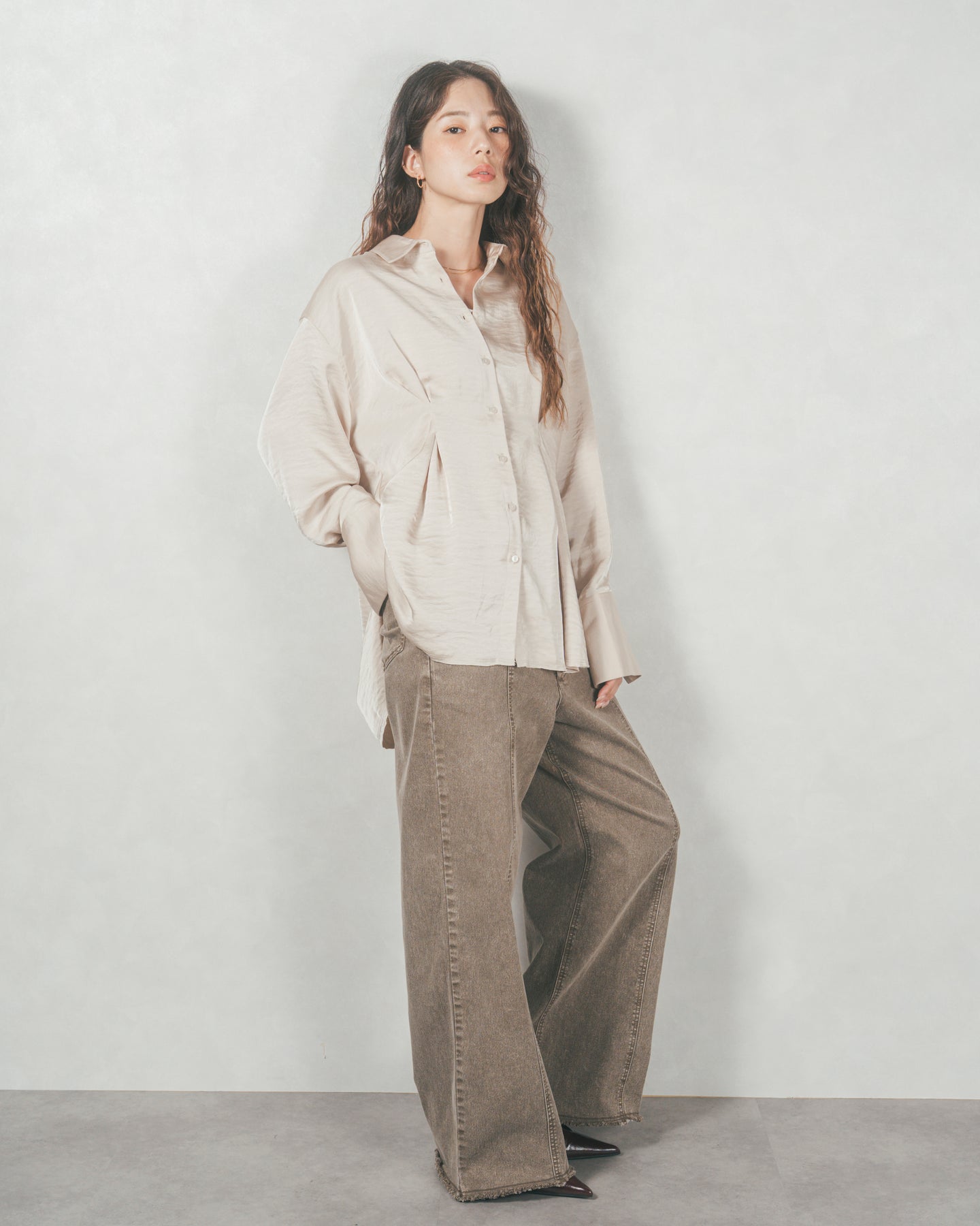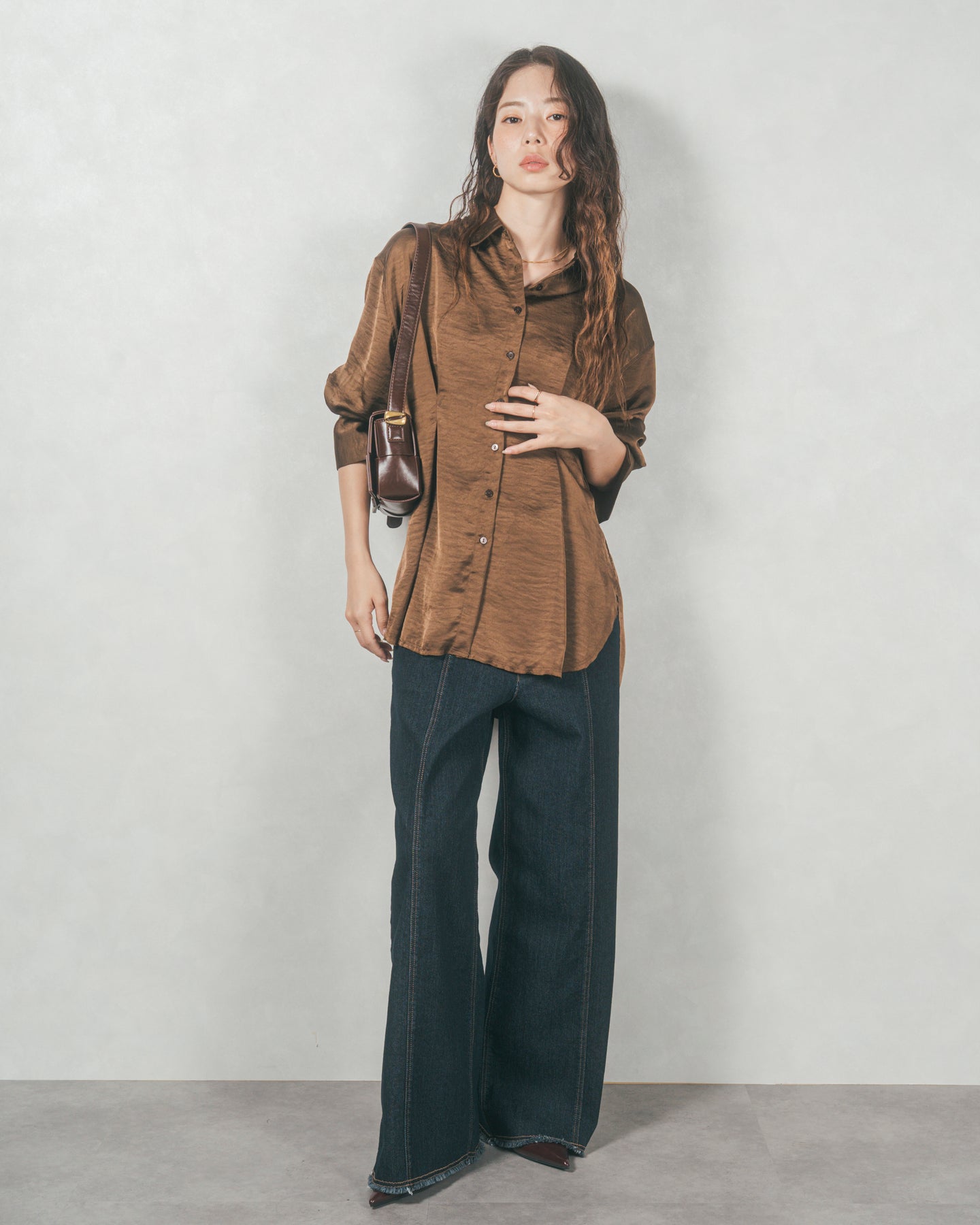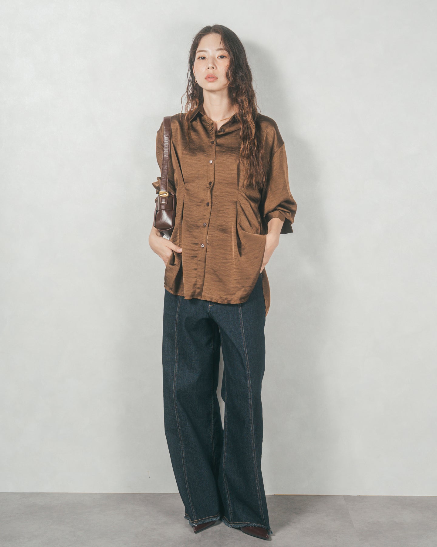 [SET]マットサテン タックシャツ+センターシーム リラックスワイドデニム(2SET)