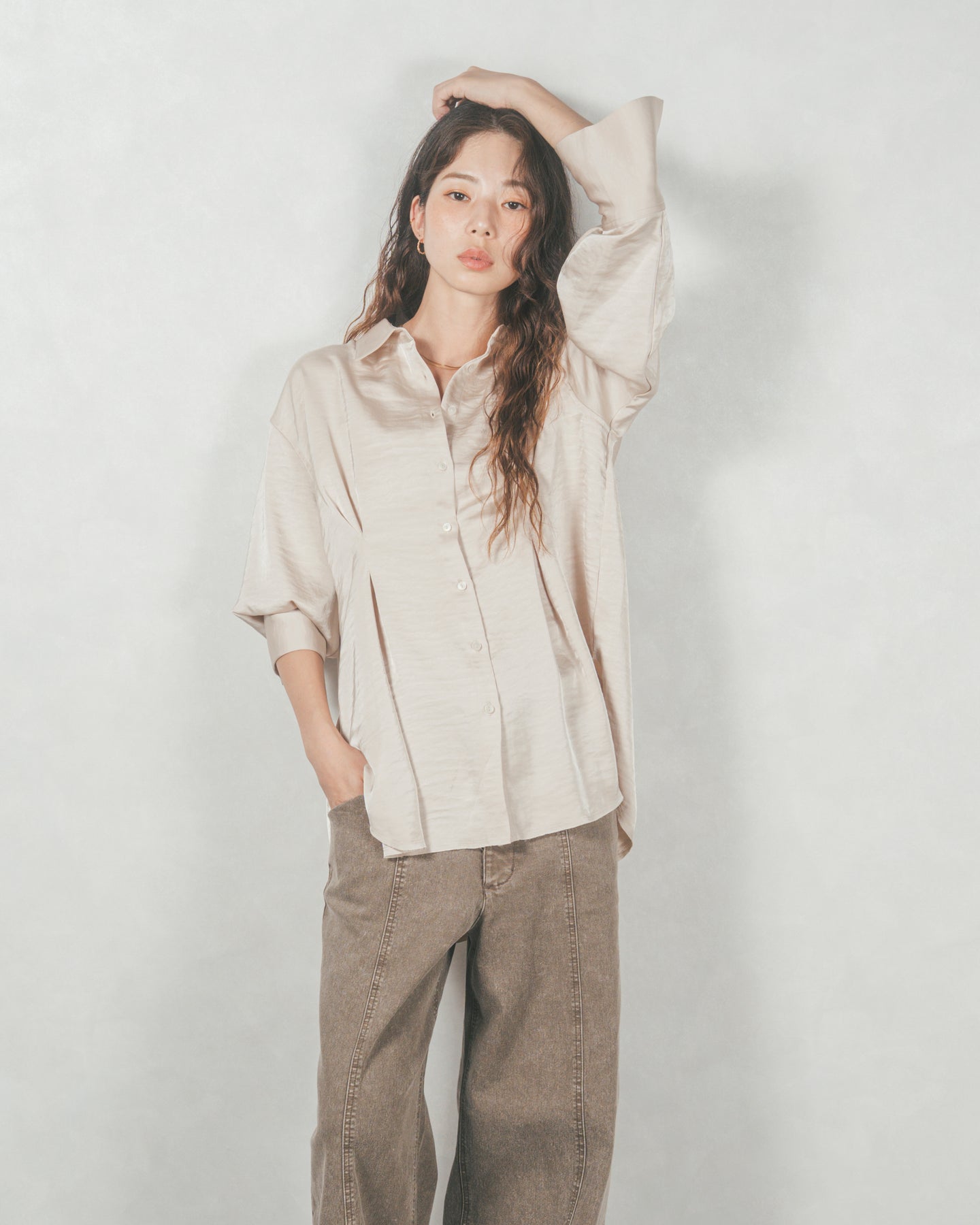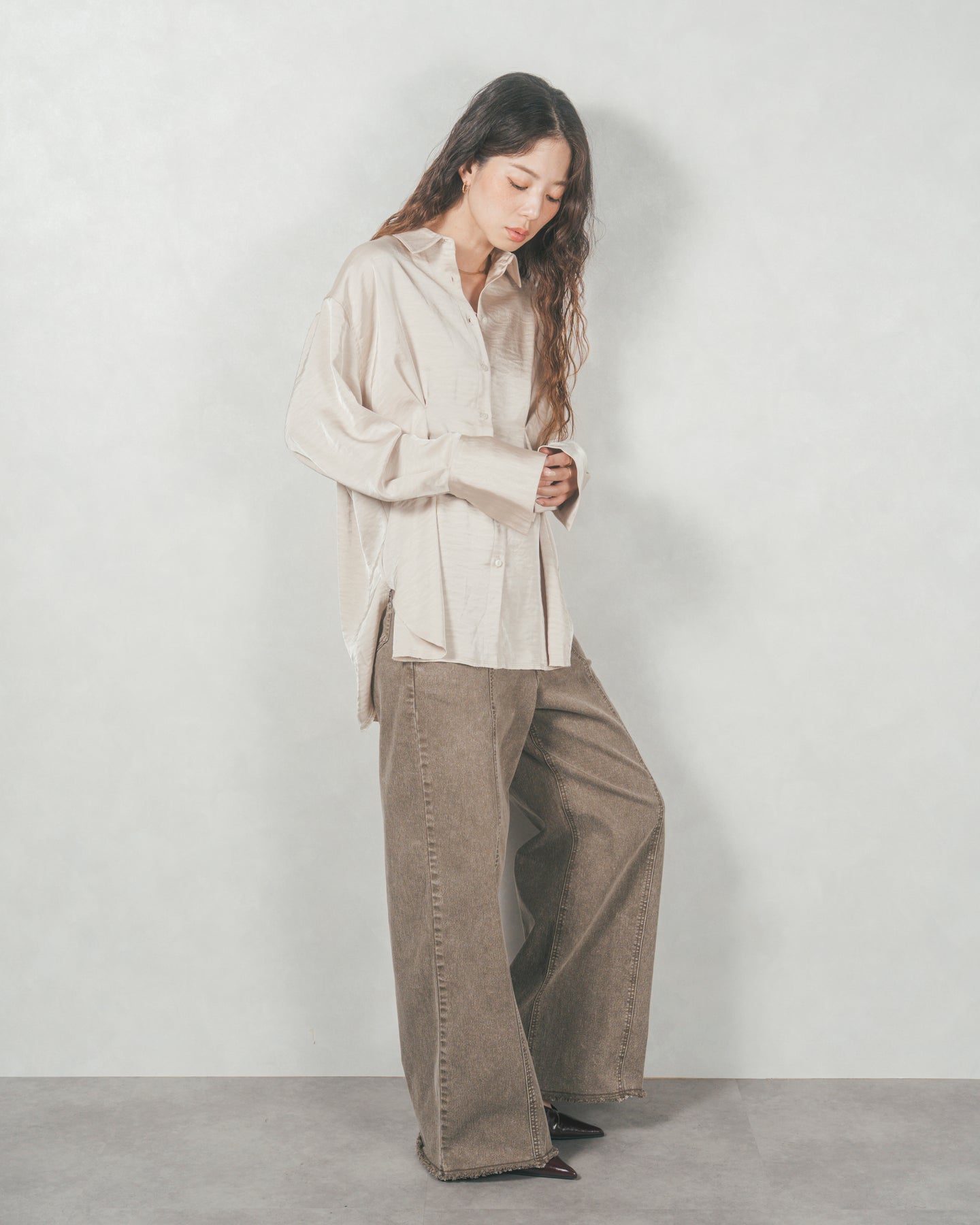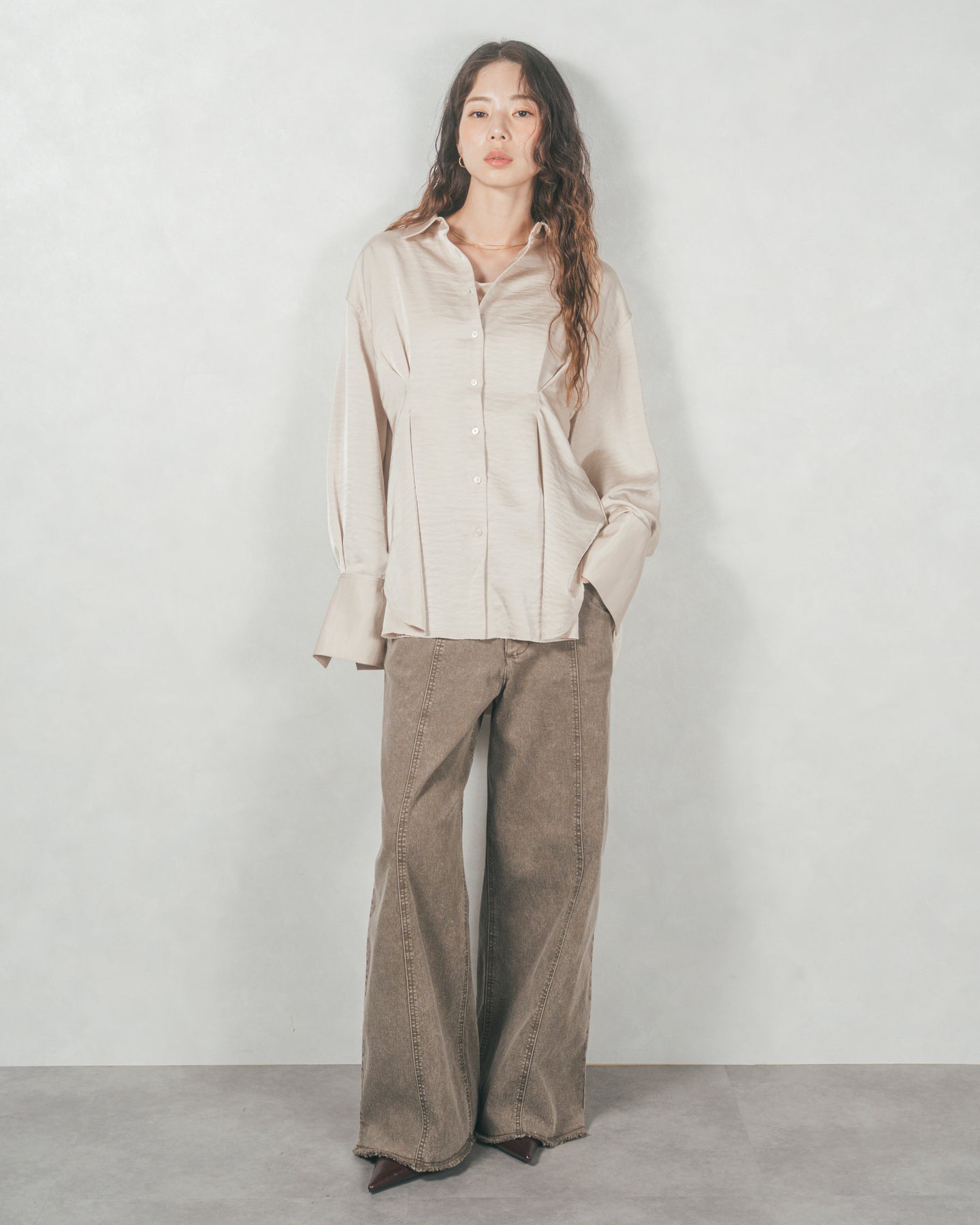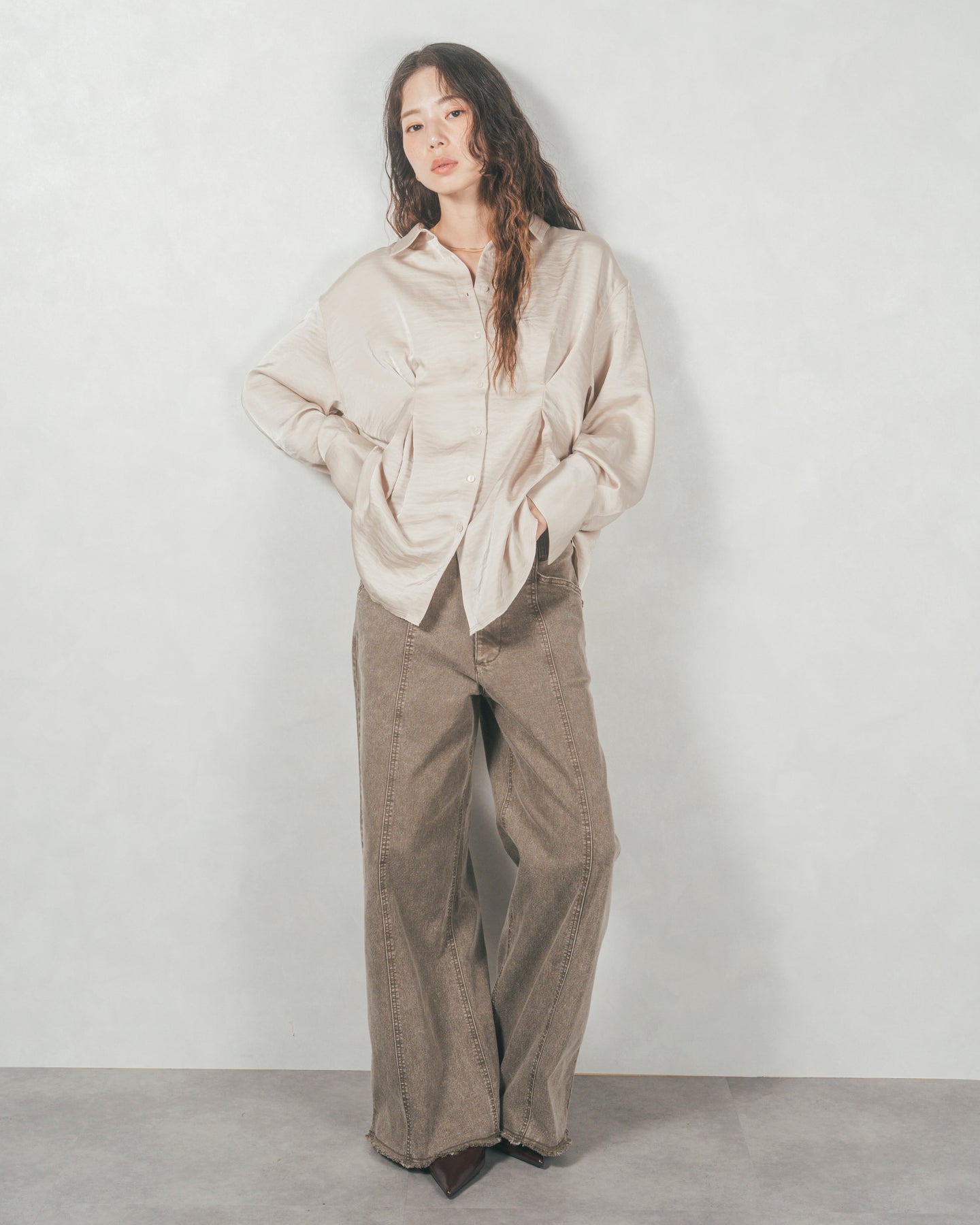 [SET]マットサテン タックシャツ+センターシーム リラックスワイドデニム(2SET)