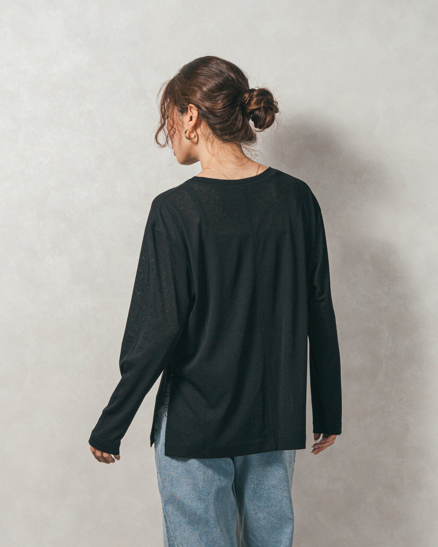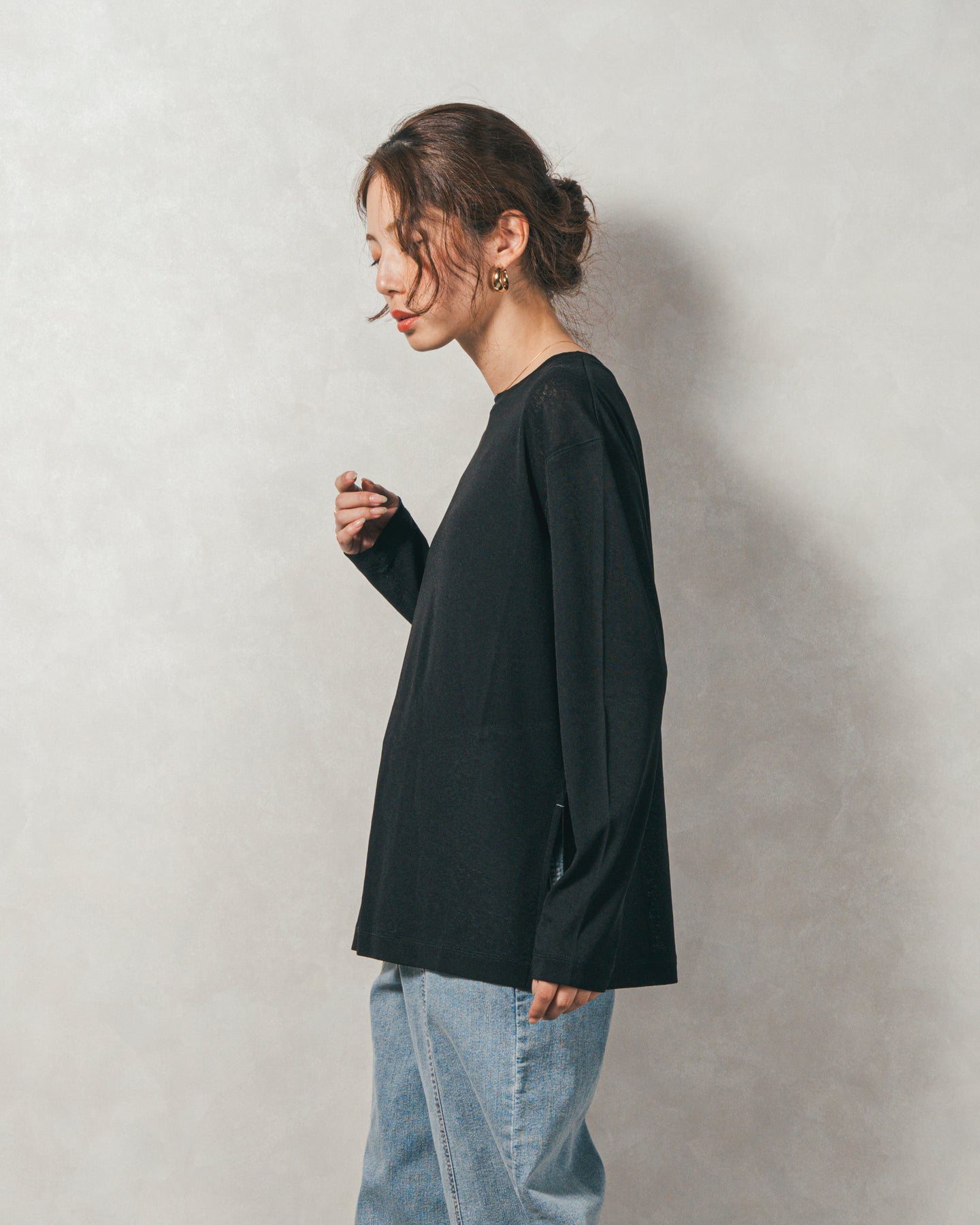 体のラインを拾わない、リラックスしたサイズ感がポイント。 サイドにある深めのスリットは、一枚で着ても「ただのシンプル」になりません。動くたびにふわりと揺れるシルエットが、大人のリラクシーなムードに。