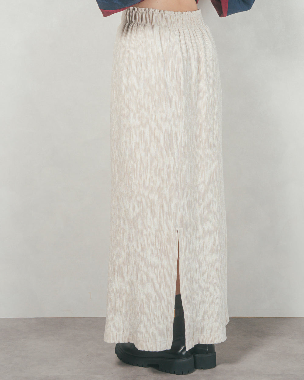 タイトすぎず、ヒップラインを拾いにくい絶妙なシルエットで、マキシ丈でも重たく見えないのがポイント。伸縮性のある生地と、足さばきのよさを考えたバックスリット入りで、見た目以上にストレスフリーな履き心地を叶えてくれます。